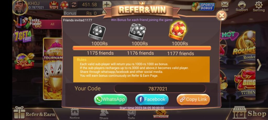 - Referral Commissions: Share your referral link via WhatsApp, Telegram, or Facebook to earn 30% of friends’ bets or fixed rewards (₹500–₹800 per valid referral).